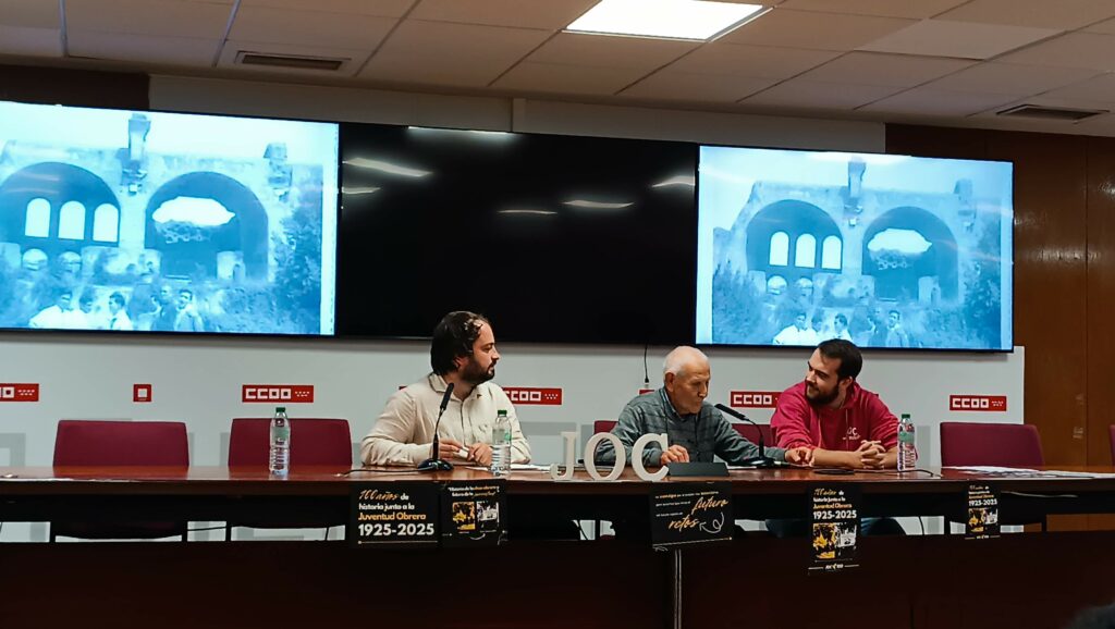 El 8 de novembre passat la Juventud Obrera Cristiana estatal va celebrar el seu centenari a la sala Trece Rosas de CCOO de Madrid amb diverses representacions de l’Estat espanyol i també amb companys de l’ACO de la diòcesi de Madrid que van llegir aquest missatge del Comitè Permanent: Compañeras y compañeros de la JOC: En el día en que conmemoráis el centenario del nacimiento de la Juventud Obrera Cristiana (JOC) que fundó Joseph Cardijn en Bélgica, os queremos saludar y felicitar. Vuestro fundador, Cardjin, quien enunció el lema que todas y todos seguimos “Un joven trabajador vale más que todo el oro del mundo” fue también nuestro impulsor hacia la militancia, desde nuestros entornos de clase trabajadora. Os queremos ofrecer nuestro testimonio como militantes obreros que también estuvimos en la JOC y os animamos a seguir el camino de Jesús, hijo de carpintero, que es para todos los cristianos nuestro ejemplo de entrega a los demás y de amor al prójimo, al humilde, al desvalido, al explotado. Jesucristo, el que queremos compartir con las trabajadoras y los trabajadores. ACO, Acción Católica Obrera, hace 72 años que nació a partir de la voluntad de militantes de la JOC que querían continuar su militancia obrera y cristiana como adultos y, en verdad, sin la JOC, hoy nuestro movimiento no existiría. En ACO, este curso 2025-2026 hemos escogido el lema: “Apasionados por hacer el bien”. Consideramos que este camino no es otro que estar presentes en las realidades que nos rodean y que, a su vez, nos hacen ser testigos y estar al lado de los más vulnerables de nuestra sociedad, los pobres, los trabajadores y trabajadoras en situación precaria o sin papeles, las mujeres que están en el mundo del trabajo y también en los cuidados de las familias. Muchas felicidades y que la fuerza obrera no se apague hasta que hayamos podido transformar la realidad en una sociedad sin discriminaciones, con techo, comida y trabajo para todos. El responsable de l’ACO a la diòcesi de Madrid, Jesús, ha explicat que hi va haver diversos testimonis i que va ser especialment emotiu el d’un exjocista de 98 anys, Juan Tejo, que va relatar que havia conegut Joseph Cardijn, el fundador del moviment, i que va poder participar al Congrés que va fer la JOC a Roma l’any 1957. A continuació hi va haver un àpat de germanor i a la tarda hi va haver una eucaristia a la Parroquia de Nuestra Señora de las Angustias presidida per bisbe auxiliar de Madrid, Vicente Martín, i amb diversos concelebrants consiliaris de les diferents zones. Per la seva banda la JOC de la comunitat d’Andalusia va celebrar aquesta diada a Còrdova uns dies més tard, el 15 de novembre, també amb la participació de la militància d’ACO de la diòcesi. La celebració es va fer a la parròquia de san Acisclo, al barri de Valdeolleras, i a continuació hi va haver un temps de compartir entre antics militants, amb testimonis i vídeos igualment emotius.