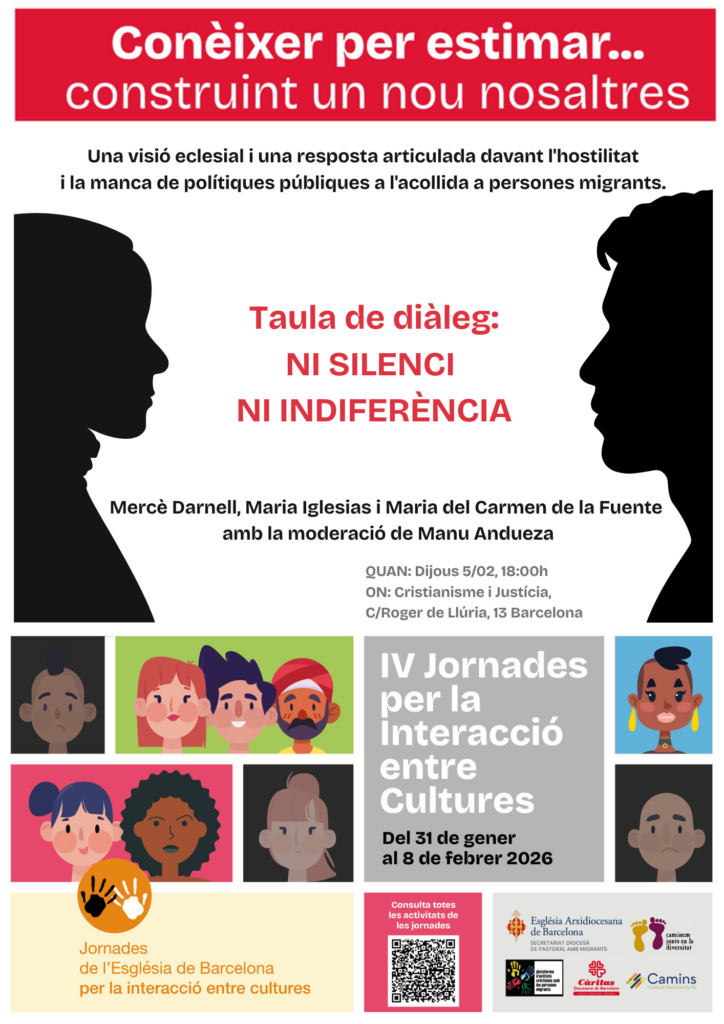 Aquesta xerrada vol oferir una visió eclesial i una resposta articulada davant l’hostilitat i la manca de polítiques públiques a l’acollida a persones migrants. Per això comptarà amb la participació de persones amb llarga experiència l’acció social des d’entitats cristianes, com Mercè Darnell, Maria Iglesias i Maria del Carmen de la Fuente i la moderació de Manu Andueza. Aquest acte se celebra en el marc de les IV Jornades de l’Església de Barcelona per la Interacció entre Cultures (podeu consultar-ne tota la programació aquí).